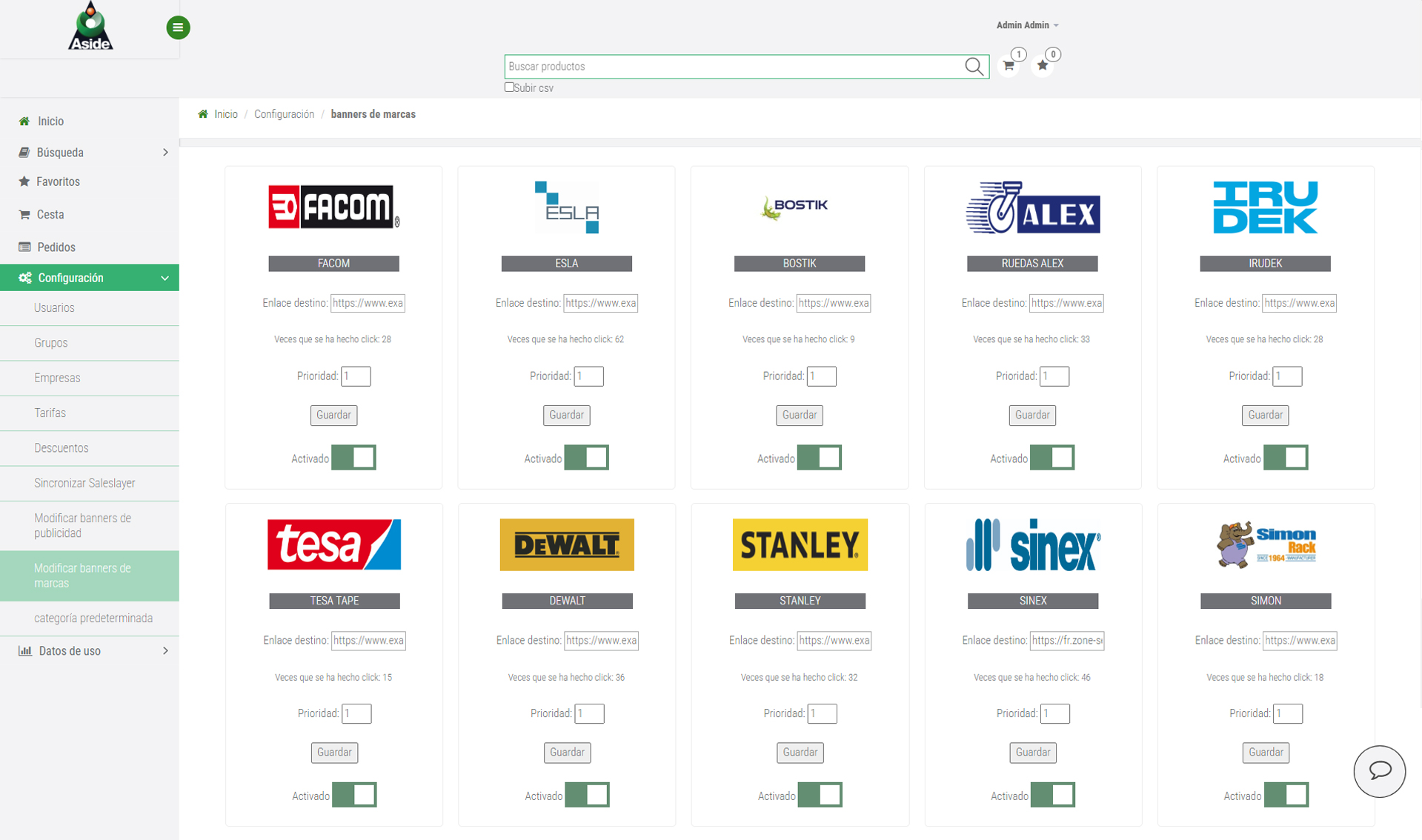 Aquí vemos todas las Marcas que hay publicadas en la plataforma, en cada una podemos añadir o modificar el enlace de destino de la imagen, el orden de prioridad, por defecto las Marcas se muestran ya ordenadas alfabéticamente, pero podemos cambiar el orden cambiando el número en este apartado, también podemos activar o desactivar cada una de ellas y guardar los cambios realizados.