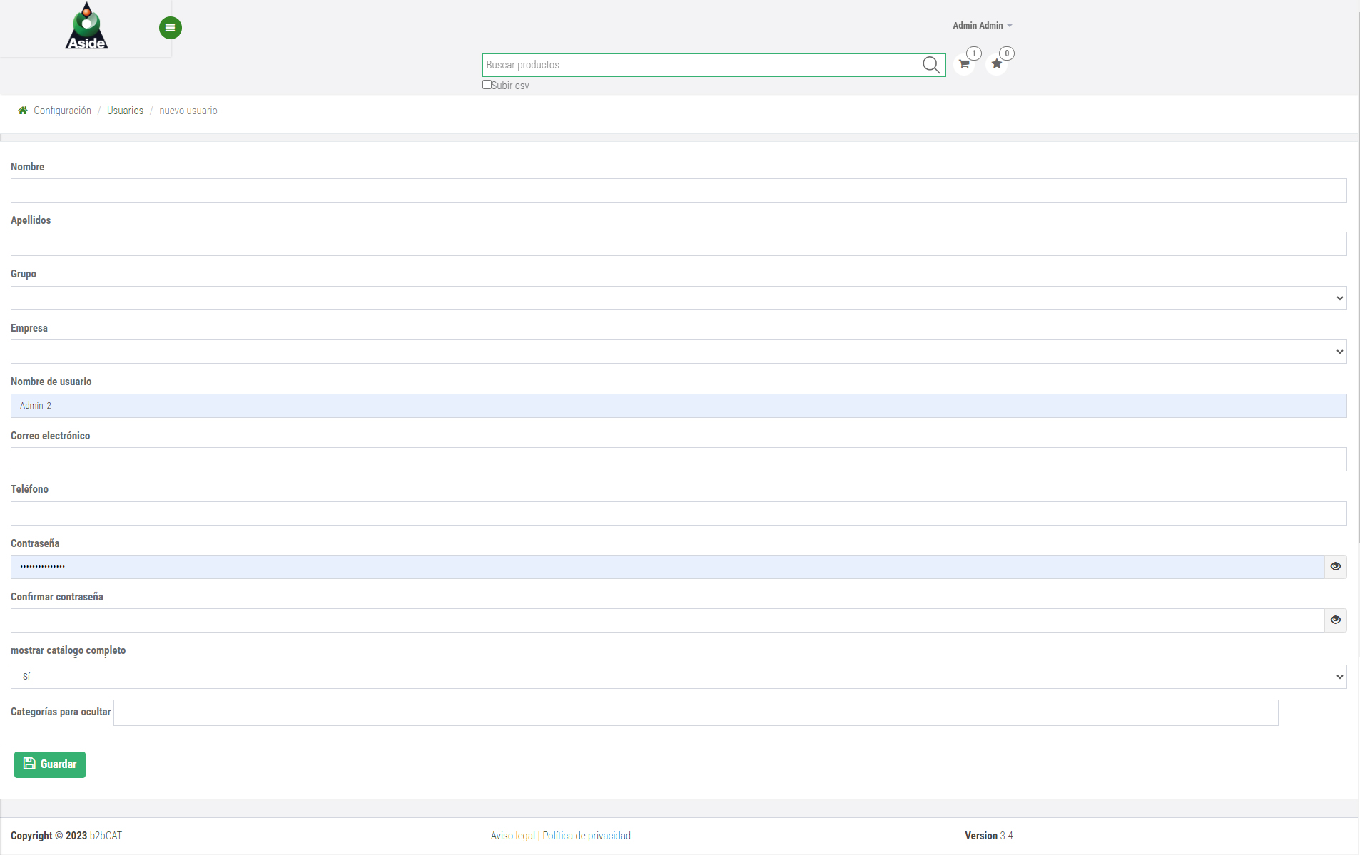 Rellenamos el resto de campos con nuestros datos, asignando una contraseña y en el campo «Mostrar catálogo completo» escogemos la opción «Sí» si queremos que al hacer búsquedas este marcado el catálogo completo.