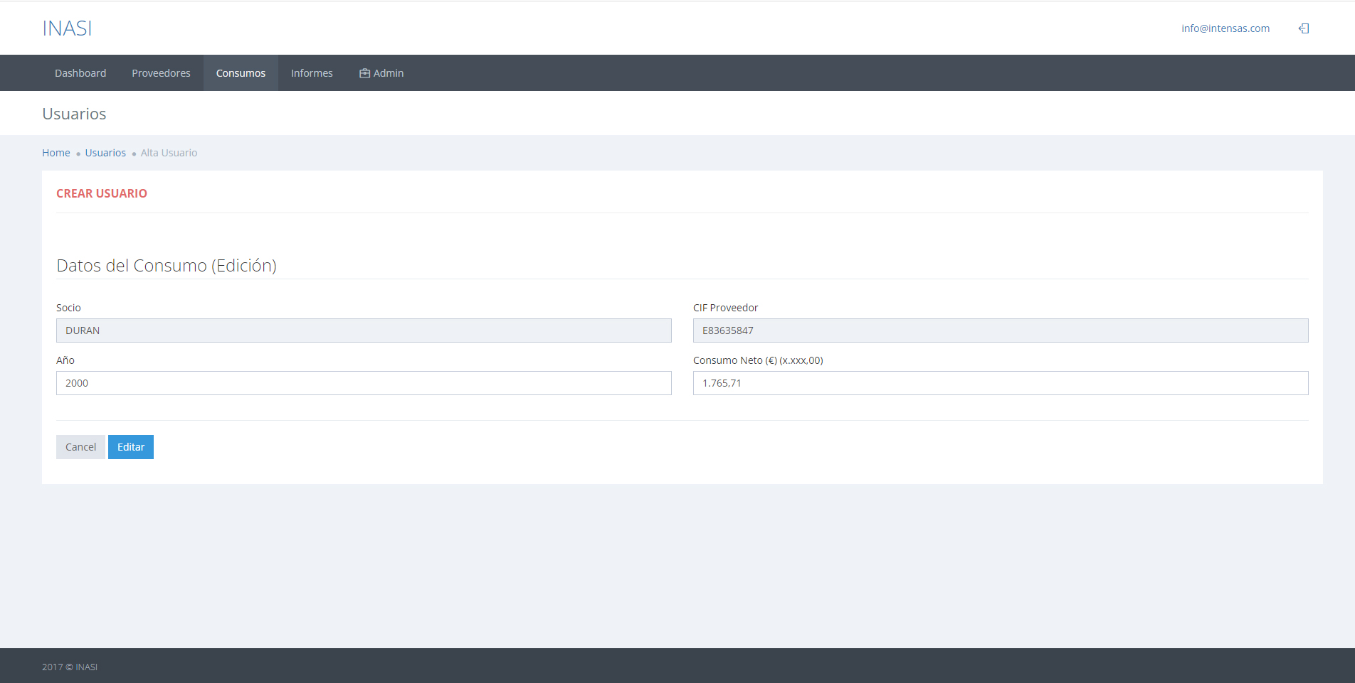 Para editar el Año y el Consumo Neto vamos al botón de la parte derecha Editar. Accedemos a una ficha de los datos de consumo, con el Socio, el CIF del Porveedor y los campos editables de año y consumo neto. Para guardar los cambios pinchamos en el botón Editar.
